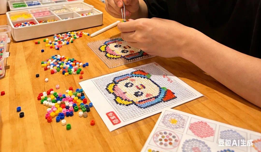 商场的DIY手作馆里,年轻人围坐桌前,捏着镊子将彩色小豆子拼出各式IP形象;不少都市白领的工位一隅,也会摆上拼豆作品。
