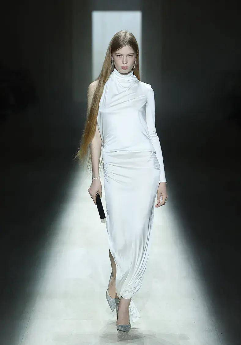 她身穿由 Gucci 新任艺术总监德姆纳设计的白色连衣裙,搭配银色高跟鞋亮相 T 台,整体表现稳当。