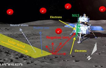 月球是无大气天体代表,太阳风可直接轰击月表。近年来研究结果表明,太阳风质子打到月壤后,大部分被注入风化层中,约10%–20%以能量中性原子(ENA)形式散射,约0.1%–1%以正离子形式反射。此外,理论和实验室研究还预期,部分质子可能在散射过程中捕获第二个电子形成负离子(H⁻)。然而,由于光致解吸作用,H⁻在太阳辐射下极易失去电子而消散,因此难以存活到环月轨道器高度,导致以往的月球轨道探测任务未能捕捉到负离子信号。而月表就位探测可以在负离子产生的源区附近直接测量,是突破这一瓶颈的关键手段。嫦娥六号着陆器上搭载了一台由瑞典空间物理研究所和中国科学院国家空间科学中心联合研制的负离子分析仪(NILS),这是国际首个地外空间专用负离子探测器,它在两天观测时间内获得了六段有效的H⁻能谱数据,实现了人类首次在月球表面对负离子的直接探测。
